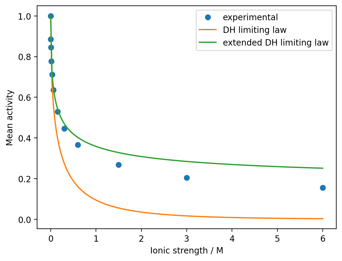 c) There are several extensions of the Debye–Hückel limiting law that aim to improve its description of the mean activity outside of the dilute limit. One such expression is: