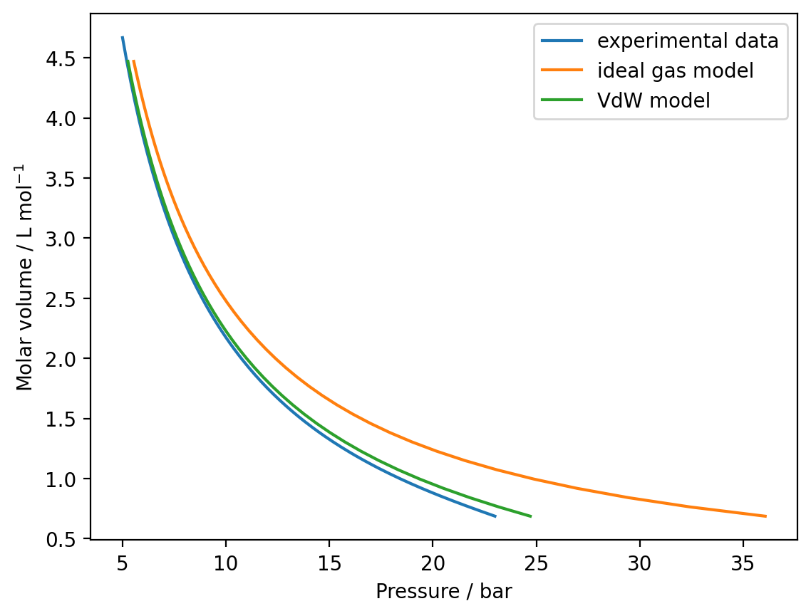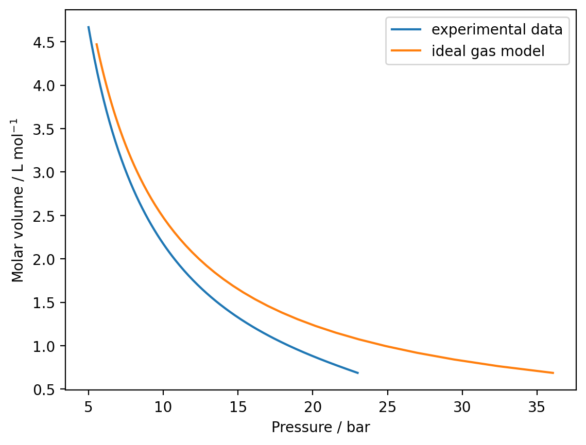 Write a function to calculate the pressure with the ideal gas law and use this to model the SF6 isotherm between \(v = 6.87 \times 10^{-4}\) m3 mol−1 and \(v = 4.47 \times 10^-3\) m3 mol−1. Plot your modelled isotherm against the experimental data.