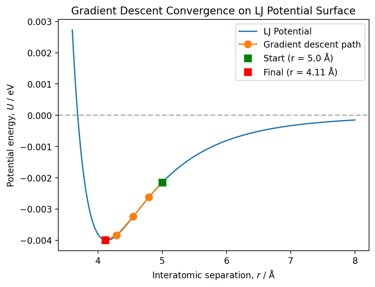 print(f"Gradient descent from r = 5.0 Å: {len(positions_gd) - 1} iterations")