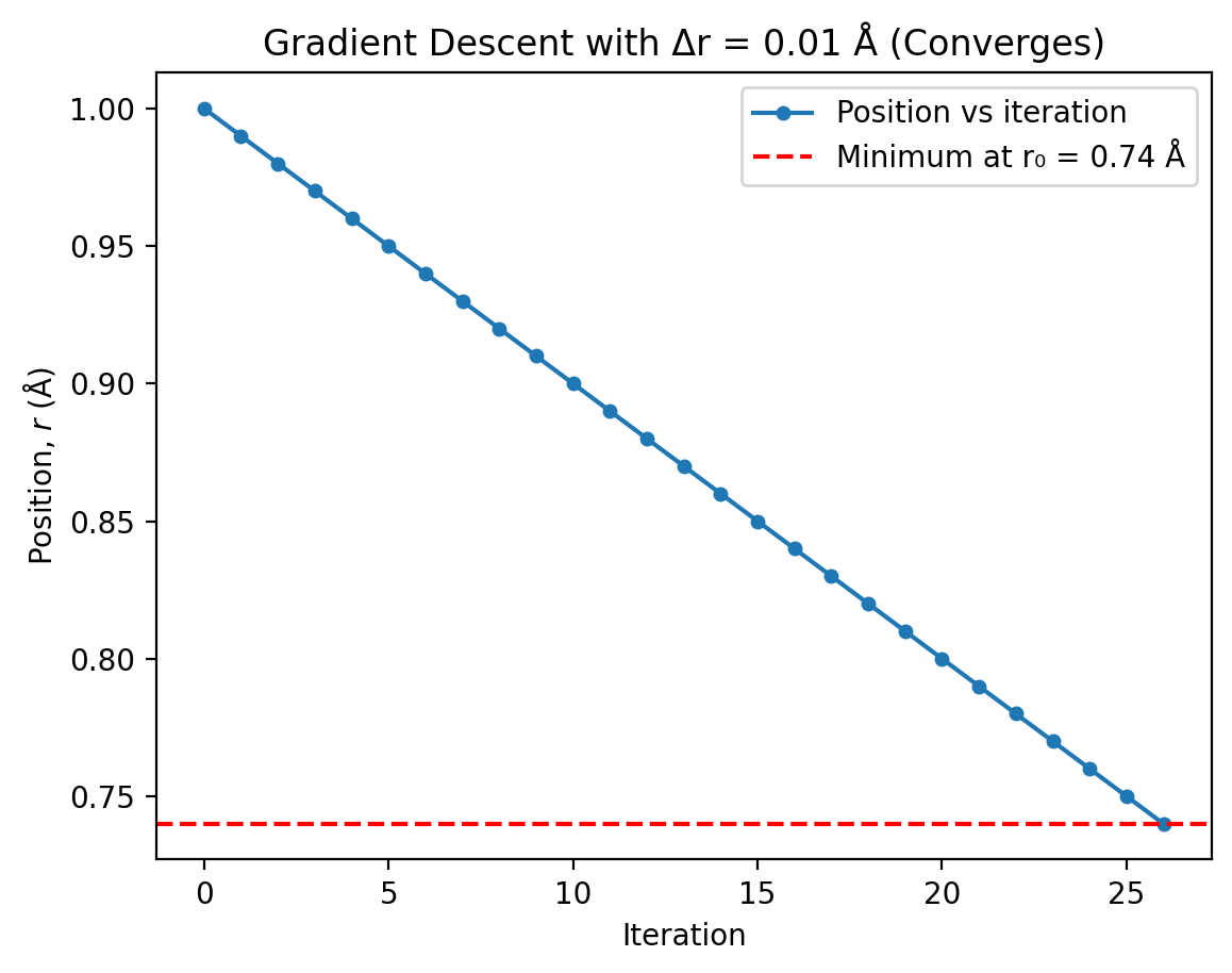 We’ll start from \(r = 1.0\) Å and explore how different step sizes affect convergence.
