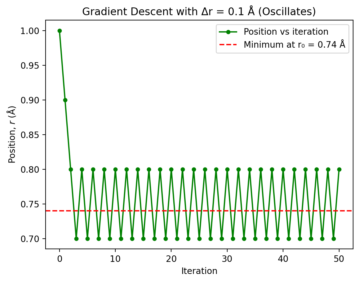 Overcorrection: The first step is: $\(\Delta r_0 = -\alpha U'(r_0) = -0.1 \times 9.36 = -0.936 \text{ Å}\)\( This moves from \)r = 1.0\( Å to \)r = 0.064\( Å, overshooting the minimum at \)r_0 = 0.74$ Å by a large margin.