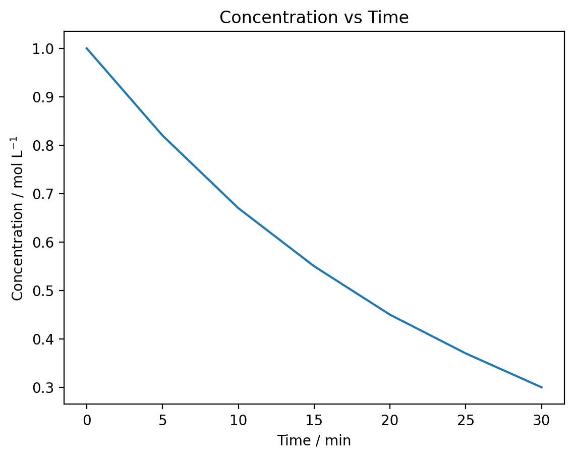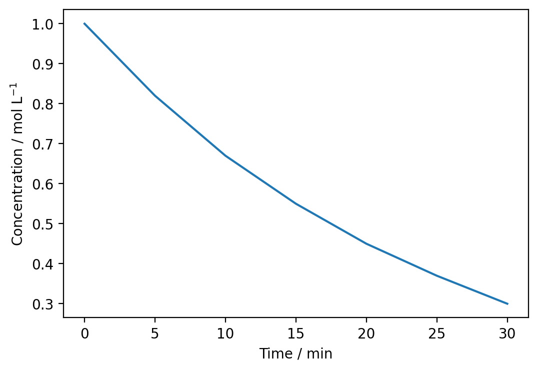 Let’s plot how the concentration of a reactant decreases over time during a first-order reaction.