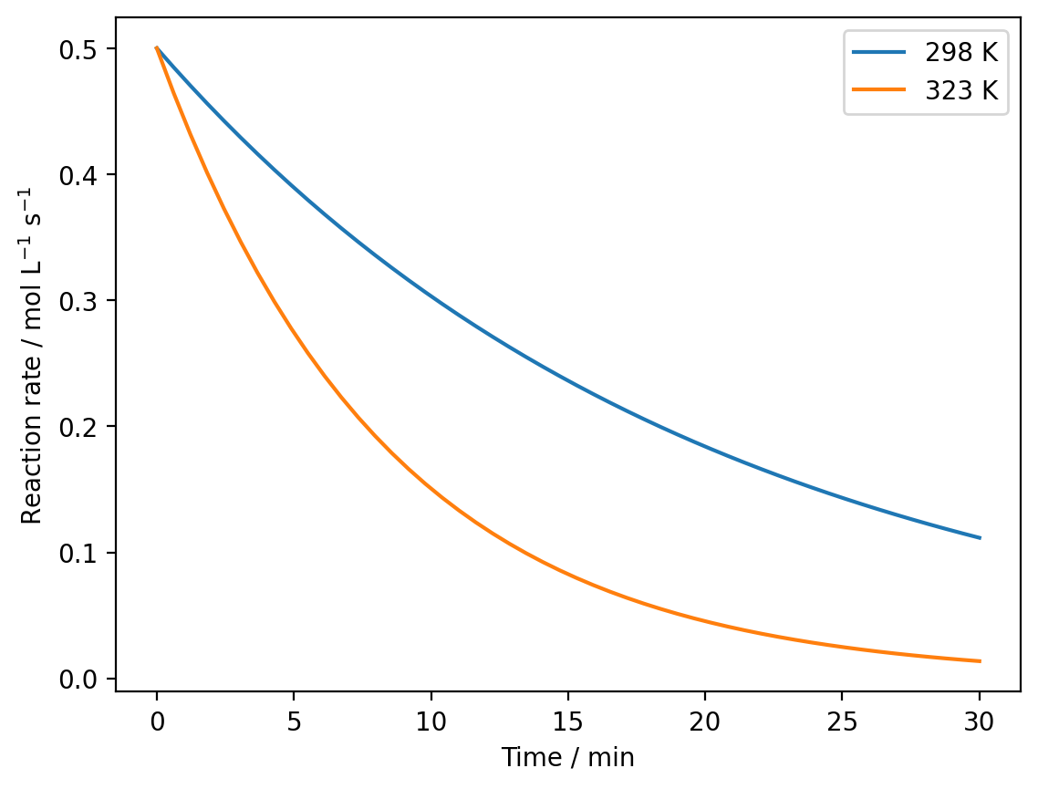 rate_323K = 0.5 * np.exp(-0.12 * time)