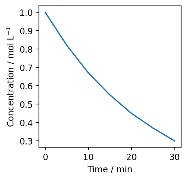 plt.ylabel('Concentration / mol L$^{-1}$')