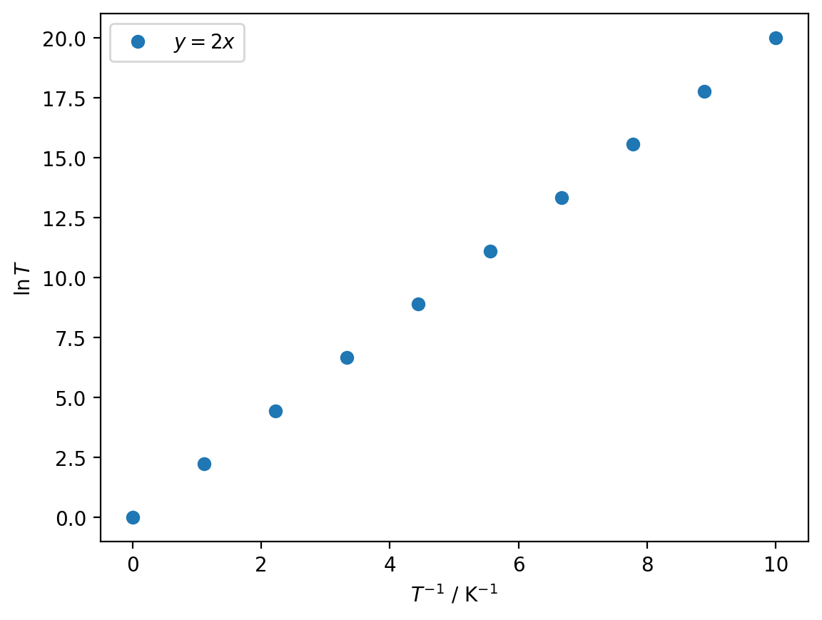 Let us look at the example of the \(x\) axis having units of inverse temperature, K−1, and the \(y\)-axis being ln(\(T\)) (which is then unitless):